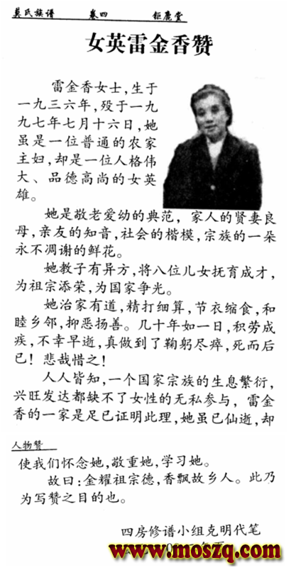在我满盈公四房家谱中,第二十页人物篇,家谱主编莫易雄(字克明)写下了<<女英雷金香赞>>。该文主人公雷金香就是我母亲。